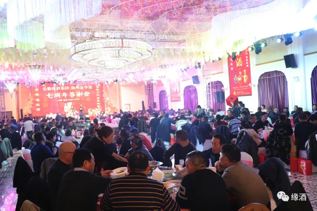为答谢新老客户对缘酒长期以来的大力支持,进一步宣传和提升缘酒品牌价值,做足江苏扬州市场,12月29日,缘酒扬州商行(办事处)成立七周年暨2021新春订货答谢会在扬州豪门大酒店举办。缘酒创牌人、缘酒文化博物馆馆长黄晔、缘酒集团董事长助理钱颖、市场总监荣秩五,扬州商行总经理王震以及当地缘酒经销商、终端客户400余人参加此次活动。晚会由著名影视演员三毛、娜娜主持。